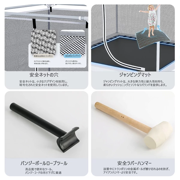 ラッキービッグナインの1.4 mスクエアキッズトランポリンは3~8歳向けに設計され、室内・室外どちらでも遊べます。2.5 mmの自動車用鋼管フレームと8 mmナイロン・ファイバーグラス四方向ジョイントでガタつきを徹底防止。金属スプリングを廃し、高反発バンジーコードを採用することで挟まれリスクをゼロに。高密度メッシュセーフティネットと食品規格PVCフットガードが全方位から守り、お子様が安心してジャンプできます。静音クッション付きでリビングの床を傷つけず、音も気になりません。
